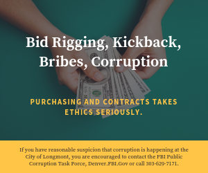 Purchasing and Contracts takes ethics seriously. If you have reasonable suspicion that corruption is happening at the City of Longmont, you are encouraged to contact the FBI Public Corruption Task Force, Denver.FBI.Gov or call 303-629-7171.