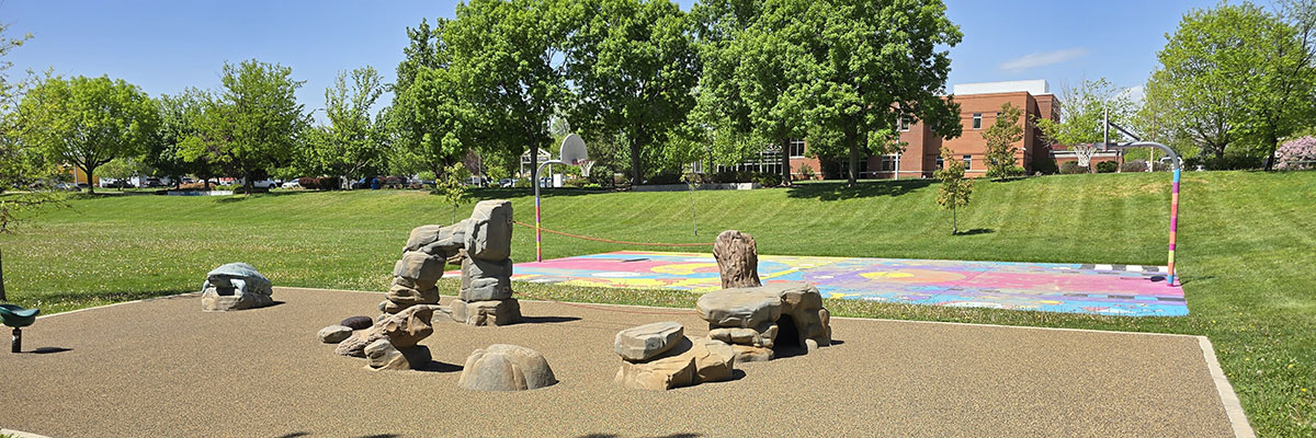 Athletic Field Neighborhood Park includes seating, a multiuse playing field, lighting, a basketball court and a play area. The park also features a spiral labyrinth that is designed to feature the rising water when the area floods.