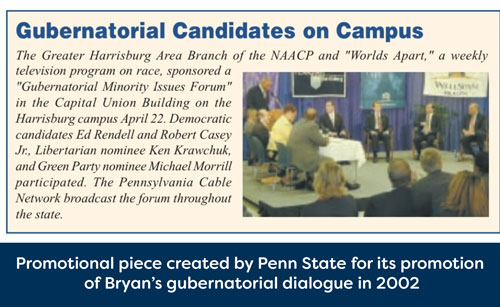 Discussing the mission of the program “Worlds Apart”, Bryan said, “I wanted to examine the social constructs, myths and stereotypes about race.” During the course of its publication, Bryan interviewed leaders from Stanford, Morehouse University and Drexel, to name a few. Bryan gave examples of some of the topics covered. “We discussed disparities in healthcare, the criminal justice system and education.” As well, in 2002, at Penn State’s Harrisburg campus, he held a gubernatorial dialogue about race.