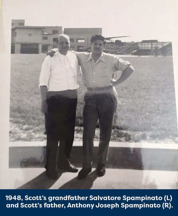 Image Description: black and white photo of two men of Italian descent, both have dark hair though the grandfather’s is bald on top, the son’s arm is resting across is father’s shoulder and Scott’s grandfather has his arm around his son’s waist: both are wearing dark pants and light-colored shirts; both are looking at the camera