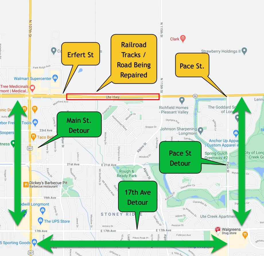 Travelers are encouraged to avoid the area during the time of construction. A detour route through Longmont is available via Main Street, 17th Avenue and Pace Street, as shown on the map below.