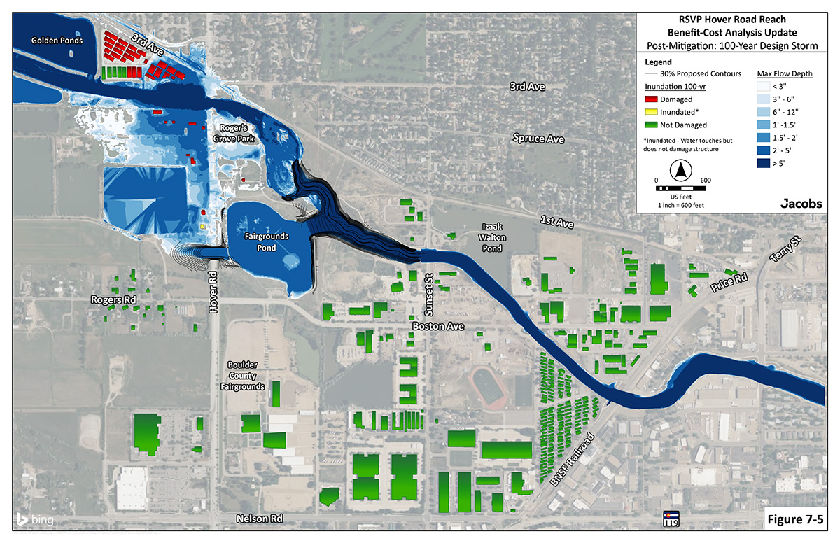 During the 2013 flood, water spilled out of the southern bank of the creek upstream of Hover St. and flowed southeast through the Fairgrounds creating a split flow. This project will capture that split flow by building a new bridge on Hover St. just north of the intersection with Boston Ave./Rogers Rd. and redirecting the water through Fairgrounds Pond and back into the creek. The two images below show how the floodplain will be improved by comparing the existing flooding depth in a 100-year event and how the built project will reduce this area.
