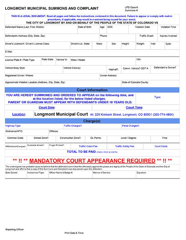 You have received a citation from a Longmont Police Officer that serves as both a summons and a complaint for Longmont Municipal Court (225 Kimbark Street, Longmont). It requires you to appear in court on the date, time, and place indicated on the front page. If you do not appear for an ordinance violation, including misdemeanors and traffic offenses, you may incur additional costs, and a warrant for your arrest may be issued. If you fail to appear or pay the fine and court costs as directed, a default judgment will be entered against you.