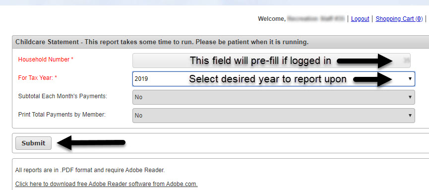 The Childcare Statement box will pop up where you will select the year to report upon, then select “Submit”.