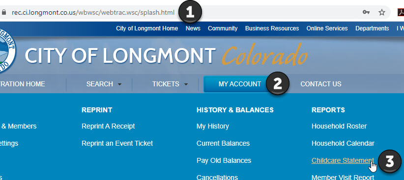 Once logged in online at https://rec.ci.longmont.co.us/wbwsc/webtrac.wsc, you can print childcare statements on demand.