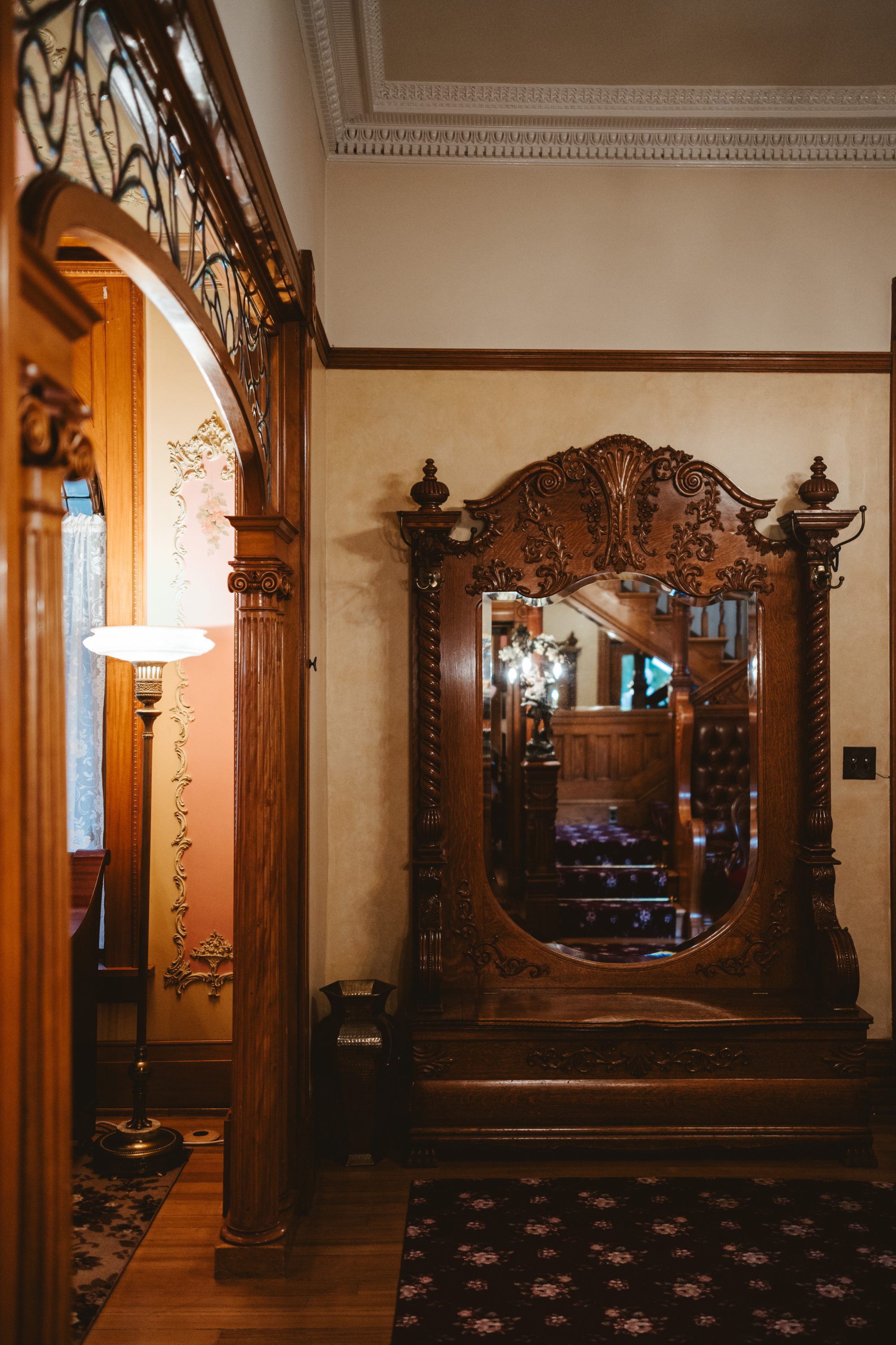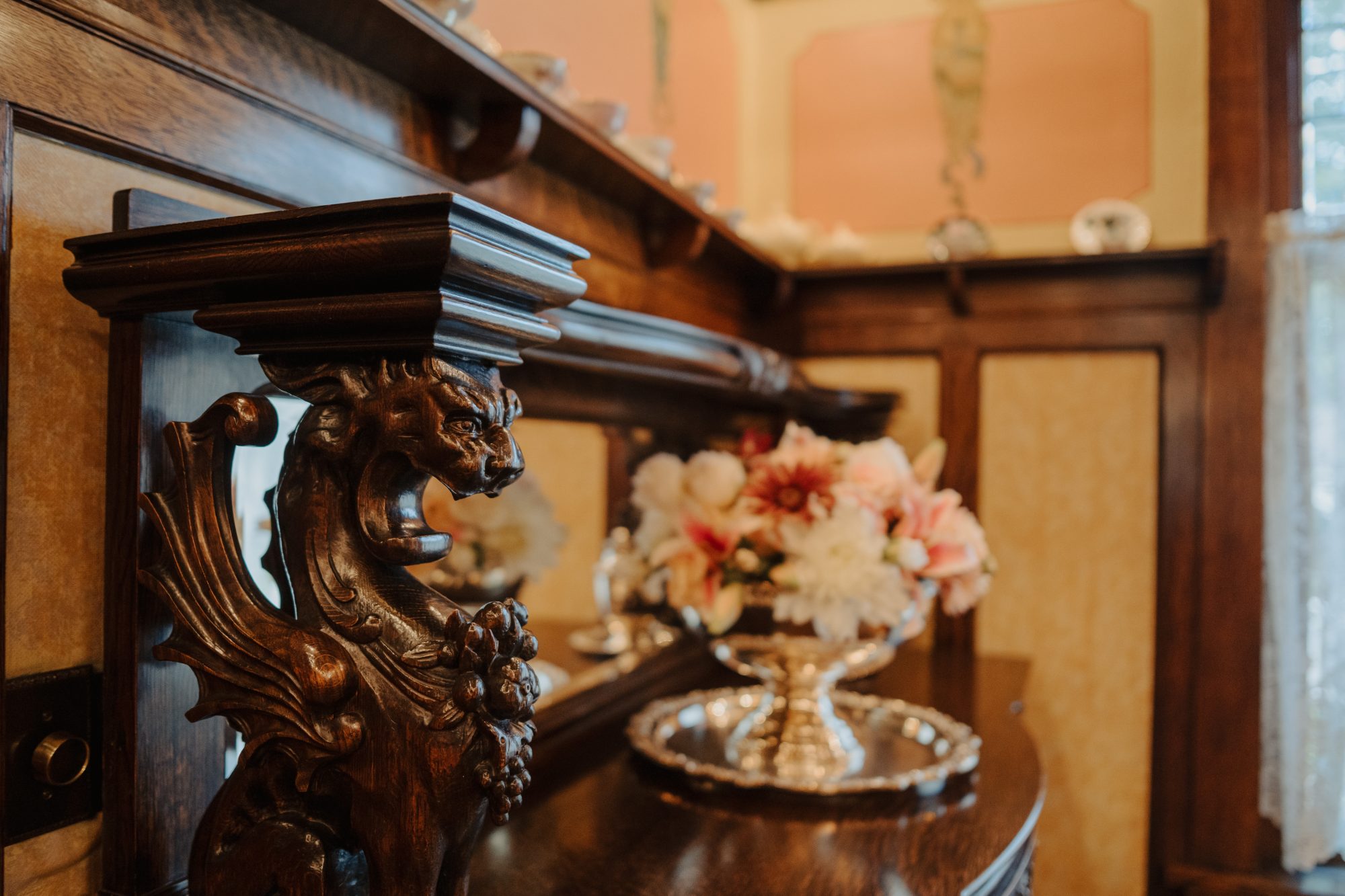 There is exquisite woodwork throughout the house with white mahogany in the parlor, fumed oak in the music room, Antwerp oak in the dining room and San Domingo mahogany in Thomas Callahan’s office. The matching couch and rocker of San Domingo mahogany were specially made for the Callahans.