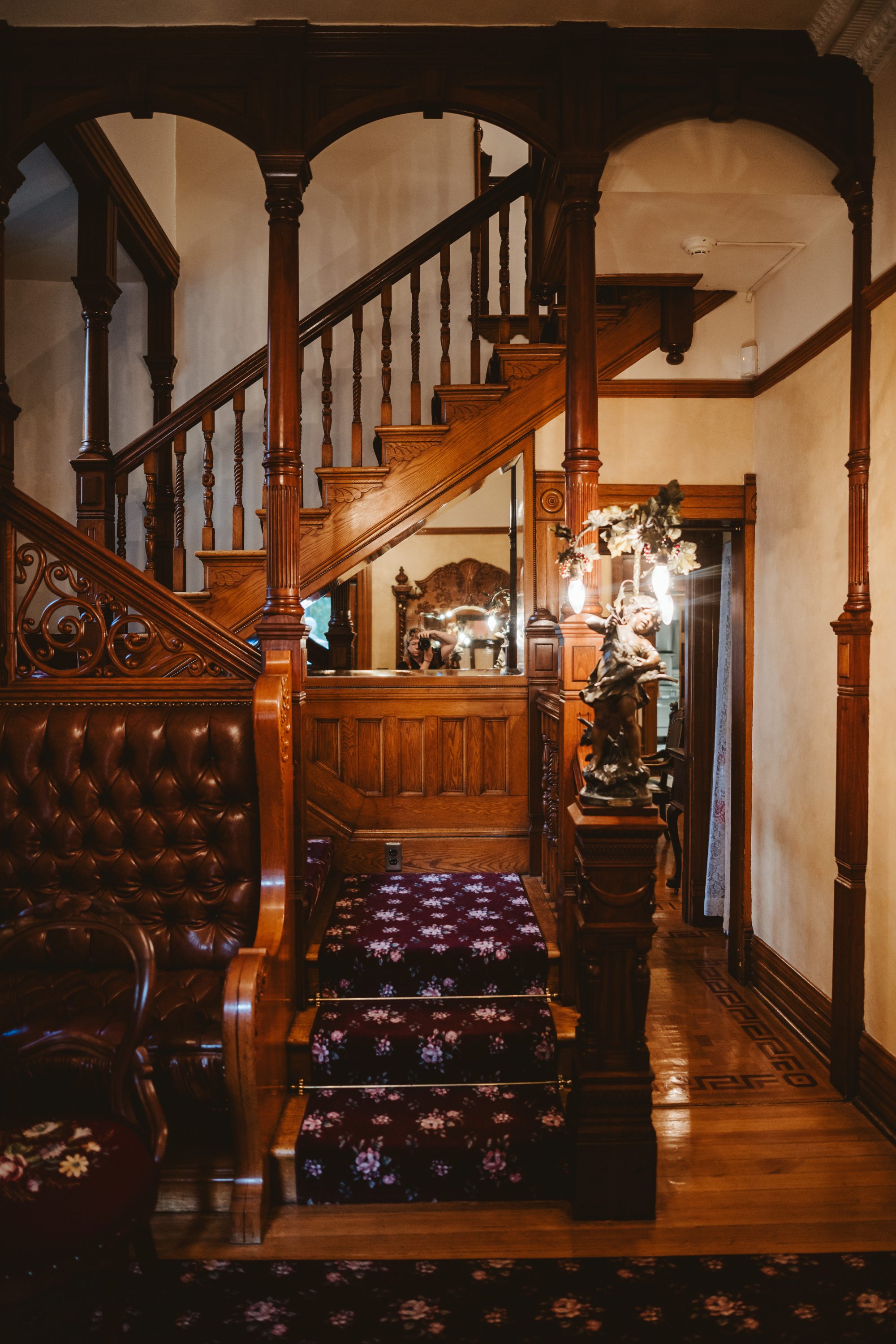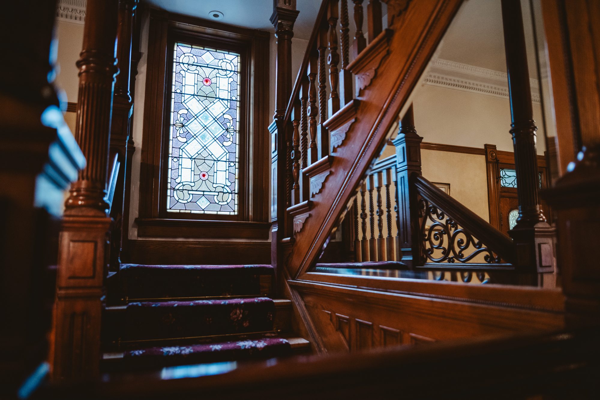 There are beautiful beveled leaded glass windows up and downstairs and two interior archways from the parlor. The stairwell has a stained-glass window with beveled leaded glass.