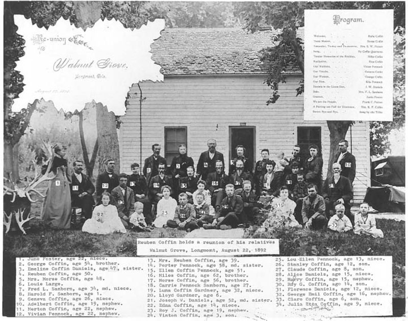 Reuben, Morse’s brother, homesteaded Walnut Grove Farm just northwest of here, at what is now Highway 119 and Weld County Road 1. Two-thousand black walnut trees were planted, and the site became a popular picnic and gathering spot. The 120 year-old trees were removed in 1991 for development. Lydia and Reuben’s descendants have donated many family photographs and objects to the Longmont Museum (image from the early 1900s)