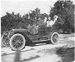 “Starting for Riverside (South St. Vrain). Reuben with Coffins. Right Hand Drive Stanley Steamer on way to Estes Park”