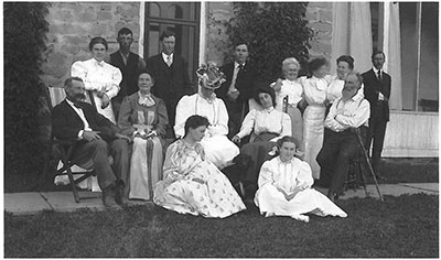 Seated second to the left in the middle row is Etta Dunbar Kelso, Julia’s older sister. Etta, an artist, lived at Sandstone Ranch until she married. Several of her paintings can be seen in the home today. And one of her hair-dye bottles, found hidden under the floor-boards, is on display in the house library.