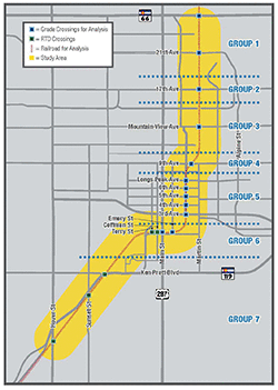< View a map illustrating Longmont’s 17 crossings divided into 7 potential Quiet Zones