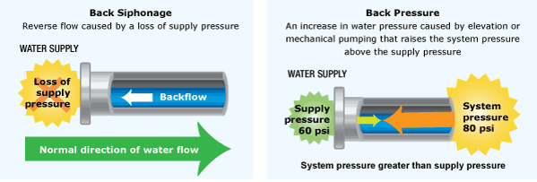 Back Siphonage: Negative pressure in the city’s water system can draw in water from a private water system. Negative pressure in the City’s water system can be caused by water main breaks, fire hydrant flushing, or firefighting.