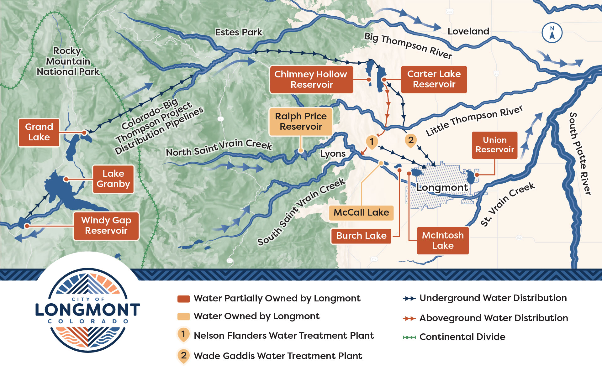 The City of Longmont’s drinking water is all surface water that comes from streams, lakes, and reservoirs that are fed by snowmelt and rainfall in the St. Vrain Creek watershed and the Colorado and Fraser Rivers on the west slope.